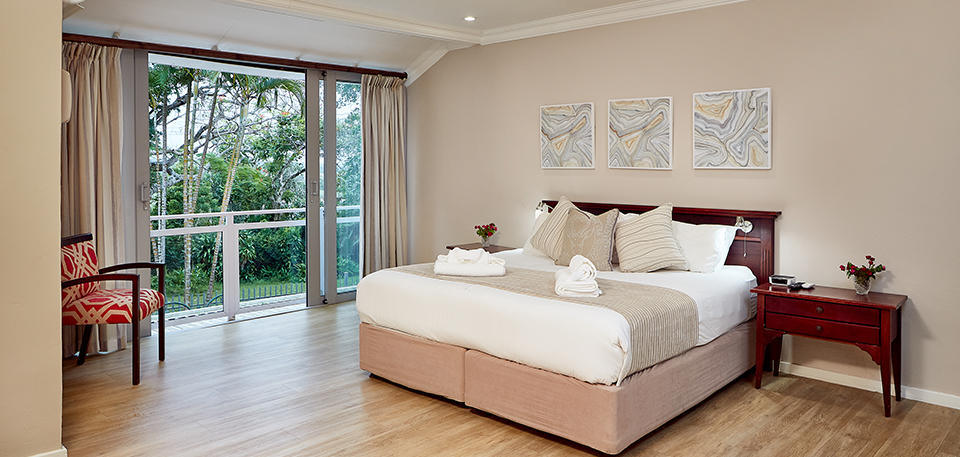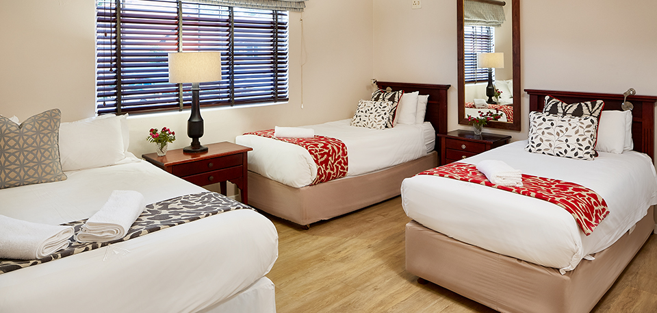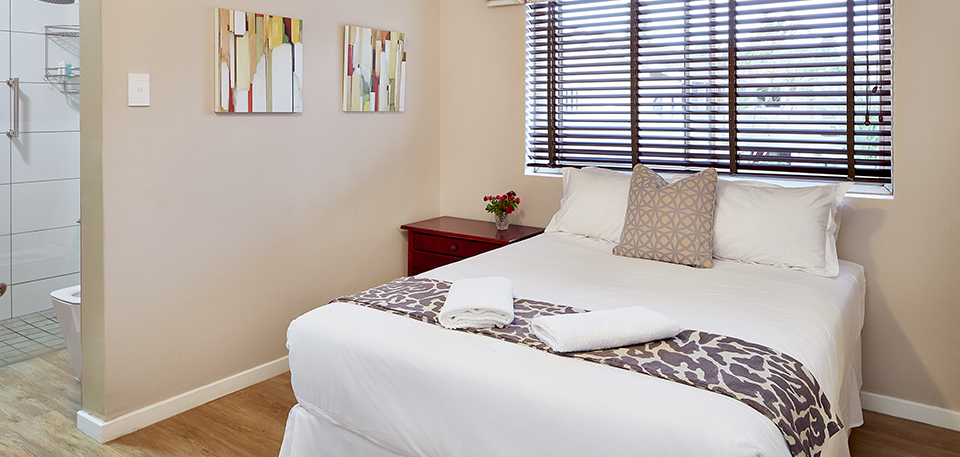 These air-conditioned apartments include a main bedroom with a king-size bed and views of the garden. The spacious lounge has a desk, features a flat-screen television and leads onto the balcony which has an outdoor seating area and charcoal/gas braai. The fully equipped self-catering kitchen is open plan and includes a breakfast nook. These apartments have stairs leading up to each unit.