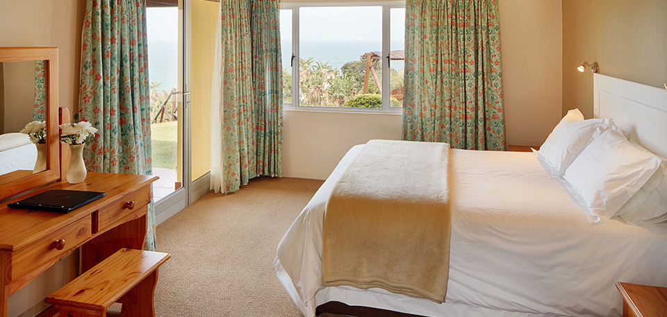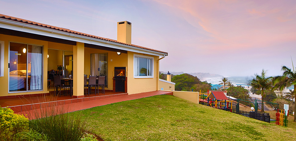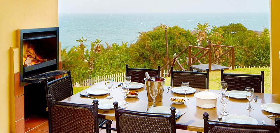 These comfortable open planned chalets include the main bedroom with a king-size bed, a second bedroom with a queen-size bed, and the third bedroom with 2 singles. The lounge and both main and second bedrooms flow onto a furnished private patio that features a charcoal braai and a glorious view of the Indian Ocean. The dining room adjoins the fully equipped self-catering kitchen which offers a 4-plate oven and stove, electric kettle, toaster, microwave and double door fridge and freezer. Each chalet is fully air-conditioned and has a private parking bay.